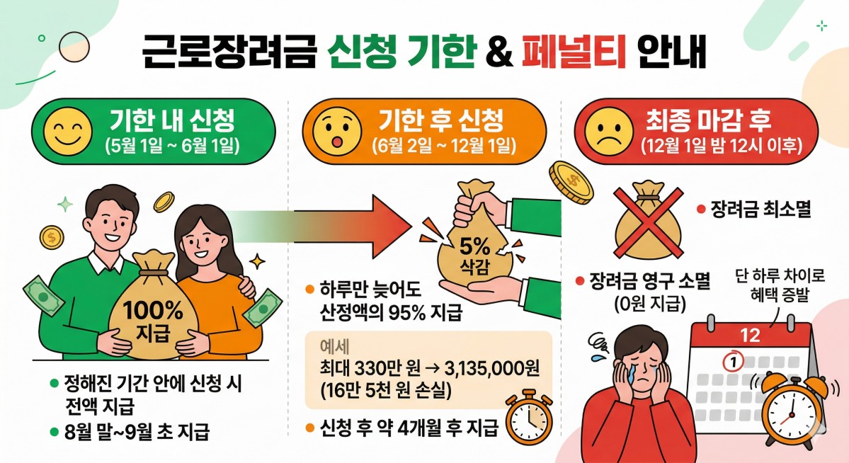 국세청은 정해진 정기 신청 기한을 단 하루라도 넘긴 건에 대해서는 '기한 후 신청'으로 자동 분류하여, 원래 받아야 할 산정 금액에서 무조건 5%를 감액하고 95%만 지급합니다. 이 기한 후 신청마저도 2026년 6월 2일부터 12월 1일까지만 열려있으며, 12월 1일 밤 12시가 넘어가는 순간 그 해의 장려금은 0원으로 영구 소멸됩니다.
